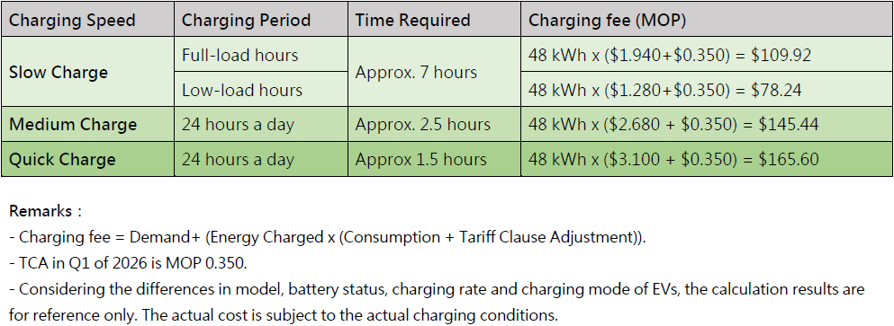 根據有關行政長官批示,於公共停車場或公共泊車處為運輸工具進行充電,按收費時段及額定輸出功率,有功電能的費用為1.420澳門元/千瓦時至4.400澳門元/千瓦時,一般充電的有功電能費用為0.817澳門元/千瓦時至1.552澳門元/千瓦時,並須按用戶合同計算視在功率的費用。另外,除了公共照明收費按相關法規的規定而調整,其他收費組別的收費維持不變。