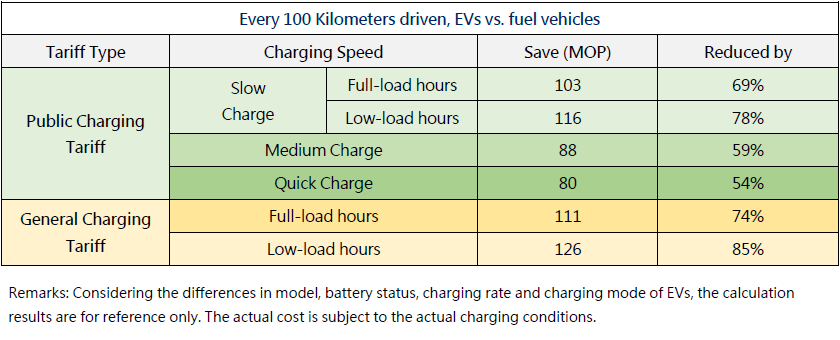 Taking every 100 kilometers driven as an example, the fuel consumption of a fuel vehicle is about 11.1 liters, while the power consumption of an EV is about 20 kWh. Based on the oil price of MOP 13.46/liter in January 2026 (including discounts), the fuel cost is about MOP 149. Driving an EV is about 54%~85% cheaper than a fuel vehicle, i.e. about MOP80~126.